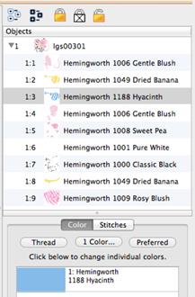 The color list does not name the areas that are colored. For example, suppose you want to change the pink shorts on the mouse design to blue. An easy way to do this is to find the area in the Object panel and select it. The color is now isolated in the Color panel and you can easily click it and select a blue.