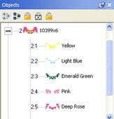 Often you will want to delete a section of stitches from a design that has been merged. When those stitches are all grouped as one color this is easily accomplished using the Object View. Open the design using the ‘+’ in the tree. Next, select the color you want to delete. Next, choose ‘Delete’ from the Edit menu or use the ‘Delete’ key on your keyboard.