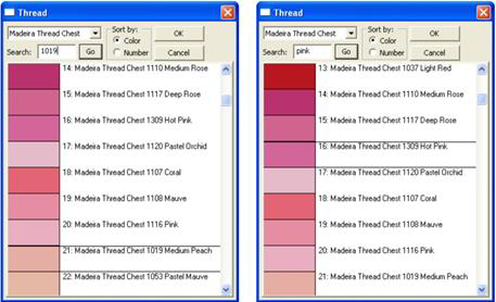 Some thread lines only have thread numbers, while others have numbers and color names. You can search either line by thread number but you can only search by name if the threads have color names. Type in the color or thread number in the search box and click ‘Go.’ Or, you can simply scroll through the list and pick one that appeals to you. Once the color is selected, click OK to apply it and close the Thread palette.