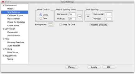 • The arrow buttons, labeled “>>” and “<<,” will copy the settings from inches to metric and vice versa. Thus, you can set up a grid that has metric spacing for machine/hoop accuracy, but can display information to you in inches.