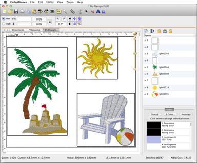 Individually selected designs can have a basting stitch added automatically. This is useful when you want to add a layer of stabilizer or some other material before the sewing of a design. The baste is always placed intelligently so that it runs immediately before the selected element(s), as shown in the screen shots below.