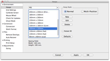 In the Preference window, under Environment, you can choose a hoop. Hoops are displayed in a sorted list, organized by embroidery file format. Most embroidery hoops are made using the metric system, so the sizes for the hoops are displayed according to the way the manufacturer sells the hoop.