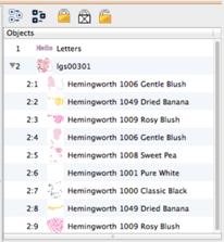 Using the Objectsview designs may be selected, sequenced and deleted.The Objectsview can display individual objects within designs where allowed. Stitch files (merged embroidery designs) are one example of a Design Type that allows the display of individual objects within the design. Clicking on the ‘+’ at the left of the design will expand that design in the Objectsview. Under that design will then appear the individual objects.