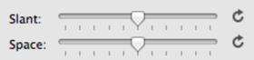 The slant of the monogram and the spacing of the monogram letters are controlled with the Slant and Space slider controls. If you use these controls and want to return the monogram to its default settings, simply click the zero control (circular arrow at right end of the corresponding slider). This will restore the default setting. The Slant gives an italic effect to the monogram.