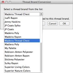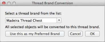 Note:Be advised that while this may be convenient for you, if your design has carefully chosen and blended colors, converting brands may cause a less than desirable result—especially if a “close match” does not exist in the new brand. Along these same lines, switching to a series of different brands and then reselecting to the original brand may not result in the same original thread colors.