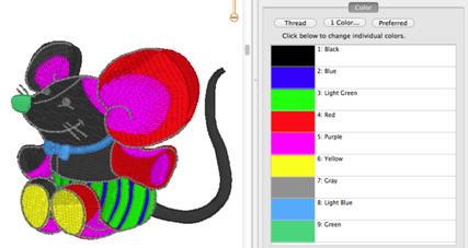 The color list does not name the areas that are colored. For example, suppose you want to change the pink shorts on the mouse design to blue. An easy way to do this is to find the area in the Object panel and select it. The color is now isolated in the Color panel and you can easily click it and select a blue.