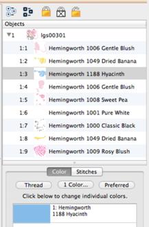 To change a thread color, simply click on the color swatch that you wish to change on the Color tab. The Thread palette will open up with the color selected in the original thread brand specified by the designer. You can select a different thread line from the drop down menu and the program will find the closest match in that chosen thread line.