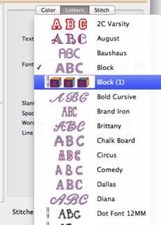 When you create a lettering design, you can now use the font that you’ve imported. Imported fonts are indicated with a needle overlaid on their icon, as seen on the picture to the left. These fonts can do almost everything that the built in fonts can do, such as make monograms, circles and even be shaped. When these letters get sized, the built-in sizing technology will recalculate their stitches.