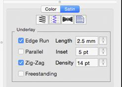 In the underlay properties, the “Edge Run” will create runs on either side of the satin, just inset by an amount controlled by the Inset field on the property page. The inset for the edge run is usually is set to fall just inside the stitching – perhaps a half-needle with or slightly more, which allows some relief around tight corners. The stitch length of the edge run is also adjustable; use smaller stitches for tight, narrow columns and longer ones if you want to reduce the stitch count, or are worried about cutting the fabric. The default is usually sufficient though.