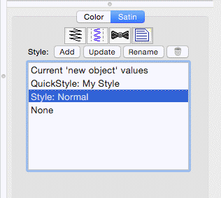 Styles allow for repeated use of properties on a given type of object. There is a style button on the top, right of each object property page. When an object has been assigned a style, that style will be highlighted in the style list, shown on the Style properties for the object. If an object was given a style, but then modified from that style, its style name will have an asterisk (*) following the style name.