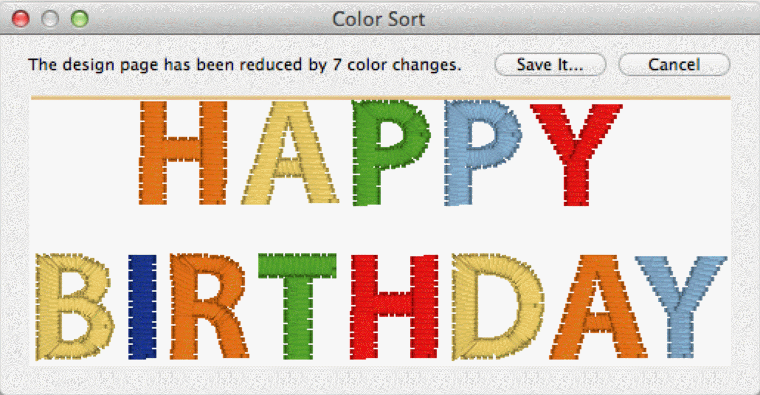 The “Happy Birthday” design has 6 unique colors but 13 color stops. To make it more efficient for sewing, you might like to optimize the sewing order to reduce extra color changes.