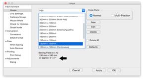 In the Preference window, under Environment, you can choose a hoop. Hoops are displayed in a sorted list, organized by embroidery file format. Most embroidery hoops are made using the metric system, so the sizes for the hoops are displayed according to the way the manufacturer sells the hoop. An approximate size in inches is also shown.