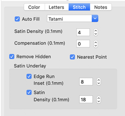 Satin: When checked, this adds a satin underlay. When checked, it applies the density value, which ranges from .3 to 2.0 mm just like the satin stitch.