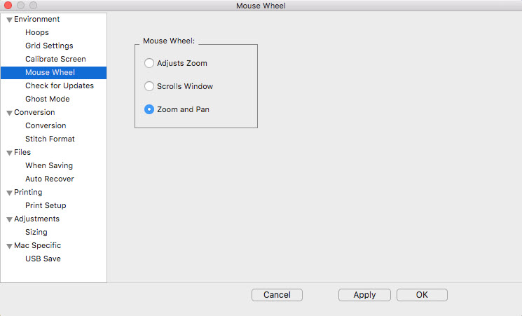 The Mouse Wheel can be used to zoom the Main View. It can also be used to scroll the page up and down. We recommend that you use the setting that allows for zooming as this is more useful to most users. The Zoom and Pan feature will center the view at the point of the cursor while zooming.