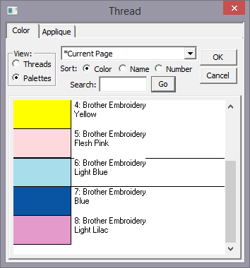 Design creators often need to utilize a palette of given colors. Sometimes these represent a customer’s job requirements, and other times it is merely a matter of needle assignment for the embroidery machine. You can create palettes at any time using the menu Utility->Threads… And you can choose to use any palette as you adjust the color properties.