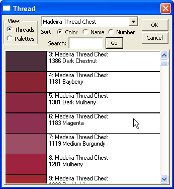 The next button, ‘Merge’ will open a thread window that lets you select one or multiple colors to be merged into the current palette. Also, there is a Delete button which removes any selected threads from the current palette.