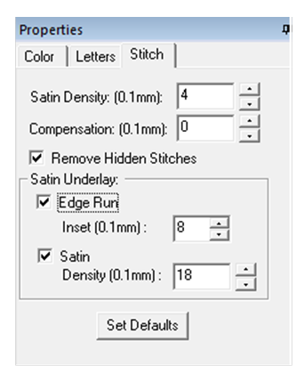 Satin: When checked, this adds a satin underlay. When checked, it applies the density value, which ranges from .3 to 2.0 mm just like the satin stitch.