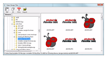 As with most views like it in Windows, the thumbnail view on the right allows single design selection, by clicking on an item. But also you can select a range of designs by first selecting a design then holding the shift key down and clicking another design. Additionally, you can use the control key to click on different designs that are not next to each other, and that will select those too. This is called a disjointed selection.