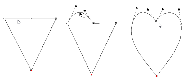 Here’s a step-by-step example of making use of minimal nodes while drawing, and good use of re-shaping: Make a heart, starting at the bottom, using all Cusps (Shift key). You only need four points! Ctrl-right-click to close the outline: