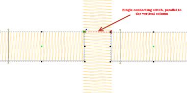 Sometimes you have to cross over an earlier stroke. This is a common problem when digitizing a Celtic knot, which has art that goes over-and-under repeatedly. One trick that is used is to have the Exit point of one stroke align with the Entry point of the column that is going to pick up on the other side. This means an exposed connective stitch will go across the ‘Over’ column, but its angle will be similar to the angle of the satin stitches which it is going across, thus it blends in. As long as the stitch will be short, usually under 3mm, you can avoid adding an object for it. Otherwise, simply add a Manual stitch object with two points, and make sure you go the right direction across.