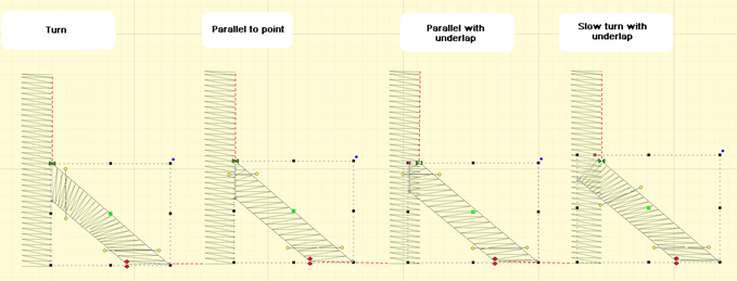In the illustration we can see four common types of strokes. The Turn is the most common and has issues with high density along the inside edge. Short stitches can overcome this, as seen in the illustration, but it’s going to be a more textured edge than the others and should be avoided unless the turn is not significant.