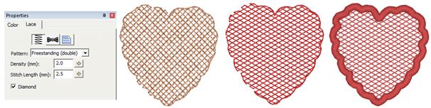In the example below, the heart came in from the library and was set to freestanding fill. The ‘Diamond’ checkbox was set and the color changed to create the middle heart. The outline was added by copy and paste of the shape, Inflate to reduce its size so the stitches would sit on the background, and the stitch type was set to Satin Border, with all underlay turned on.