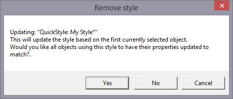 When you have modified a QuickStyle-stylized object, and you want to update the QuickStyle to match the current object properties, use the ‘Update’ button. This means that other objects with the same style set will not match. Since the main reason for styles is to have all the objects working the same, there is an option presented to update all the other objects that use the same QuickStyle to have their properties match the current one.