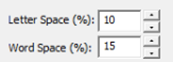 The spacing of letters between each letter and each word can be set using these boxes. The spacing is always a percentage of the font height.