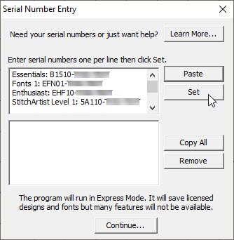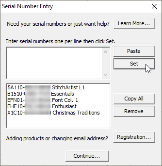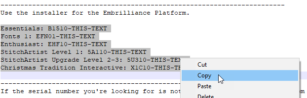 We know that most of you have more than one Embrilliance product, and that means you are collecting serial numbers. Naturally, you can type them in, one per line, remembering to type the dashes in, but do not add spaces in the number.