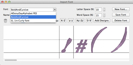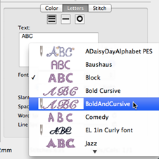 When you create a lettering design, you can now use the font that you’ve imported. Imported fonts are indicated with a needle overlaid on their icon, as seen on the picture to the left. These fonts can do almost everything that the built in fonts can do, such as make monograms, circles and even be shaped. When these letters get sized, the built-in sizing technology will recalculate their stitches.