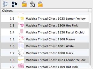 Because this is a stitch file, each object is all the stitches that are contained within a given color. In this instance, when you compare the object list next to the color list, you’ll see that they match. For example, object 1:3 corresponds to color three in the following samples.