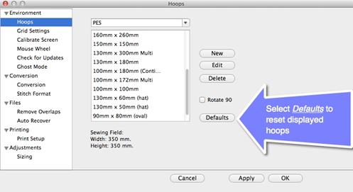 In the Preference window, under Environment, you can choose a hoop. Hoops are displayed in a sorted list, organized by embroidery file format. Most embroidery hoops are made using the metric system, so the sizes for the hoops are displayed according to the way the manufacturer sells the hoop.