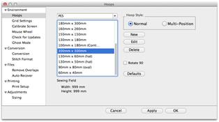 Using this window you can select different hoops, the selected hoop to be shown rotated 90°, add new hoops of your own creation or edit the selected hoop. The ‘Defaults’ button reloads the hoops that are installed with the program. This is useful if you update the program or have previously deleted some default hoops.