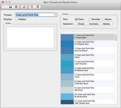 The Thread / Palette Editor provides a place for you to manage which threads you own, create smaller palettes for specific projects, and even share those palettes with others.