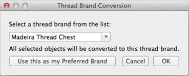 Note: Be advised that while this may be convenient for you, if your design has carefully chosen and blended colors, converting brands may cause a less than desirable result—especially if a “close match” does not exist in the new brand. Along these same lines, switching to a series of different brands and then reselecting to the original brand may not result in the same original thread colors.