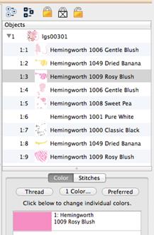 The color list does not name the areas that are colored. For example, suppose you want to change the pink shorts on the mouse design to blue. An easy way to do this is to find the area in the Object panel and select it. The color is now isolated in the Color panel and you can easily click it and select a blue.