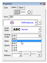 Monogram Sewing OrderOn the Letters tab there is a Sewing Order box. Choose the order in which the letters are sewn from this control. For a simple monogram you probably do not want to change the default order. However, if you want to overlap the center letter on the others, you could choose the ‘ACB’ order (second choice).