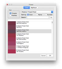 The next button, ‘Merge’ will open a thread window that lets you select one or multiple colors to be merged into the current palette. Also, there is a Delete button which removes any selected threads from the current palette.