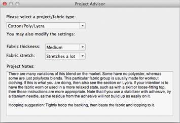 The system also provides instructions, helpful how-to advice and some words of caution when necessary. First, you select a project from the list. If your exact project or fabric is not listed, there are enough choices available where you can choose something very similar. Next, you can tell the Advisor if your fabric has more or less stretch, and you can adjust thickness. The Advisor takes your input in account as it makes its recommendations, which are displayed as text in the window.