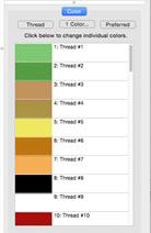 Changing colors is done via the Color tab on the Property Sheet, which is the lower panel on the right hand side of your screen. The color tab displays the thread sequence of the design. Selecting a color swatch on the tab doesn’t select anything in the design; it simply allows you to select and apply a different color from any of the thread brands loaded into the program.