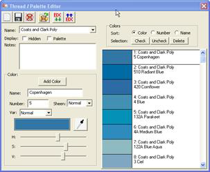 The Enthusiast version of the program adds the ability to create your own colors and add them to thread lines and palettes. To create a new thread or palette, click the ‘New’ button on the toolbar.