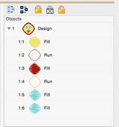 When observing the relationships between designs and objects, see that the Object View, normally docked on the right of the program screen, has at its ‘root’ level the designs, and when you expand a design, you’ll see the individual objects that compose that design. If you select a design, by clicking on it in the Object View, you will be selecting all the objects contained in that design as well. If you select all the objects in a design, selection of the design itself is optional. This is useful for copy/paste operations.