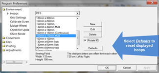 There are many hoops that are built into the program, and you can add your own. As the program updates over time, or if you have edited a hoop, you can use the “Defaults” button to restore the program to the hoops provided. The “Default” button will not, however, remove any hoops you’ve added yourself.
