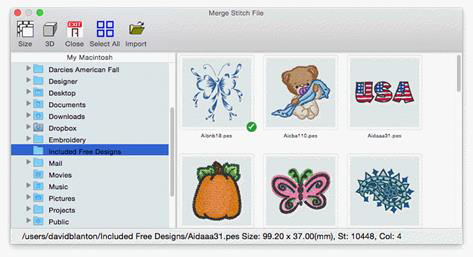 As with most views like it in Windows, the thumbnail view on the right allows single design selection, by clicking on an item. But also you can select a range of designs by first selecting a design then holding the shift key down and clicking another design. Additionally, you can use the control key to click on different designs that are not next to each other, and that will select those too. This is called a disjointed selection.