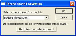 The ‘Thread…’ button allows you to change thread brands or to set a preferred brand by choosing a thread brand from the pop down list. Once a preferred brand is selected, you can easily change all the colors in any design to your preferred brand by clicking, “Use this as my preferred brand.”