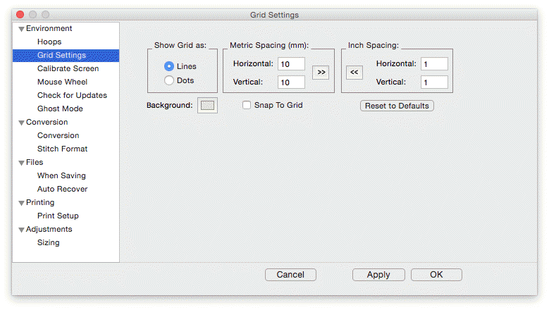 • The Grid is adjustable too. You can alter the display of gridlines by choosing between lines and dots. You can also set the spacing of the grid, and that can be set separately for both metric and inch settings.