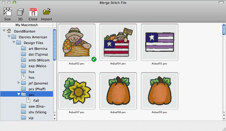 •   The Size control of this dialog determines the preview size of the design thumbnails (the design does not have to be selected for the determined size). The 3D control shows the preview in 3D, i.e. it shows simulated stitches.
