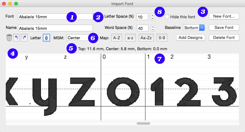 For this reason, we have created AlphaTricks. This window is brought up from the Utility menu item, “Import Font…” and it lets you import fonts as well as manage ones you’ve already imported. Let’s take a look at this Import Font dialog box as it contains the mapping shortcuts as well as other useful information and tools.  The following numbered picture is shows you the tools and buttons in groups as they will be described below: