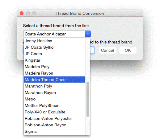 A thread brand can be selected on a per-design basis or can be made preferred.