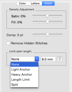 The ‘Limit Satin Length’ option is used to help prevent looping on top of the fabric and reduce ‘snag-ability’ from long satin stitches. There are several options to choose from when the lengths are long. An ‘Anchor’ is a simple run that’s placed every other line of stitching. This allows the alternating satin strokes to cover the added needle penetrations. The result is a reasonably smooth stitch, almost as smooth as a satin, but well tacked down, and not likely to snag or loop. ‘Length Limit’ is one traditional look to anchor the satin, and it will simply drop the needle whenever the stitch is too long. ‘Split’ will insert a needle land in the middle of any stitch that’s too long, which results in a look of a split-satin, or columnar appearance.